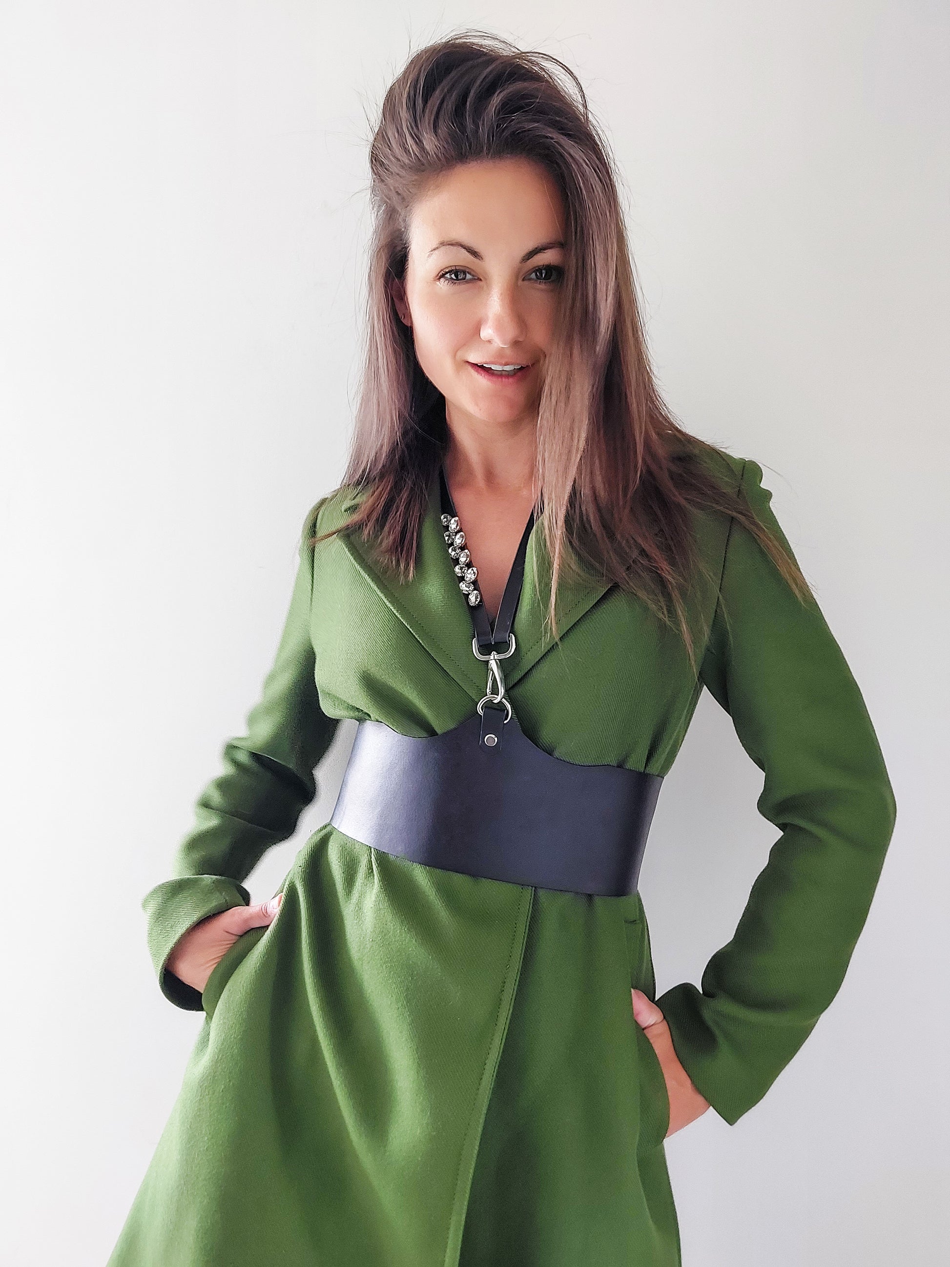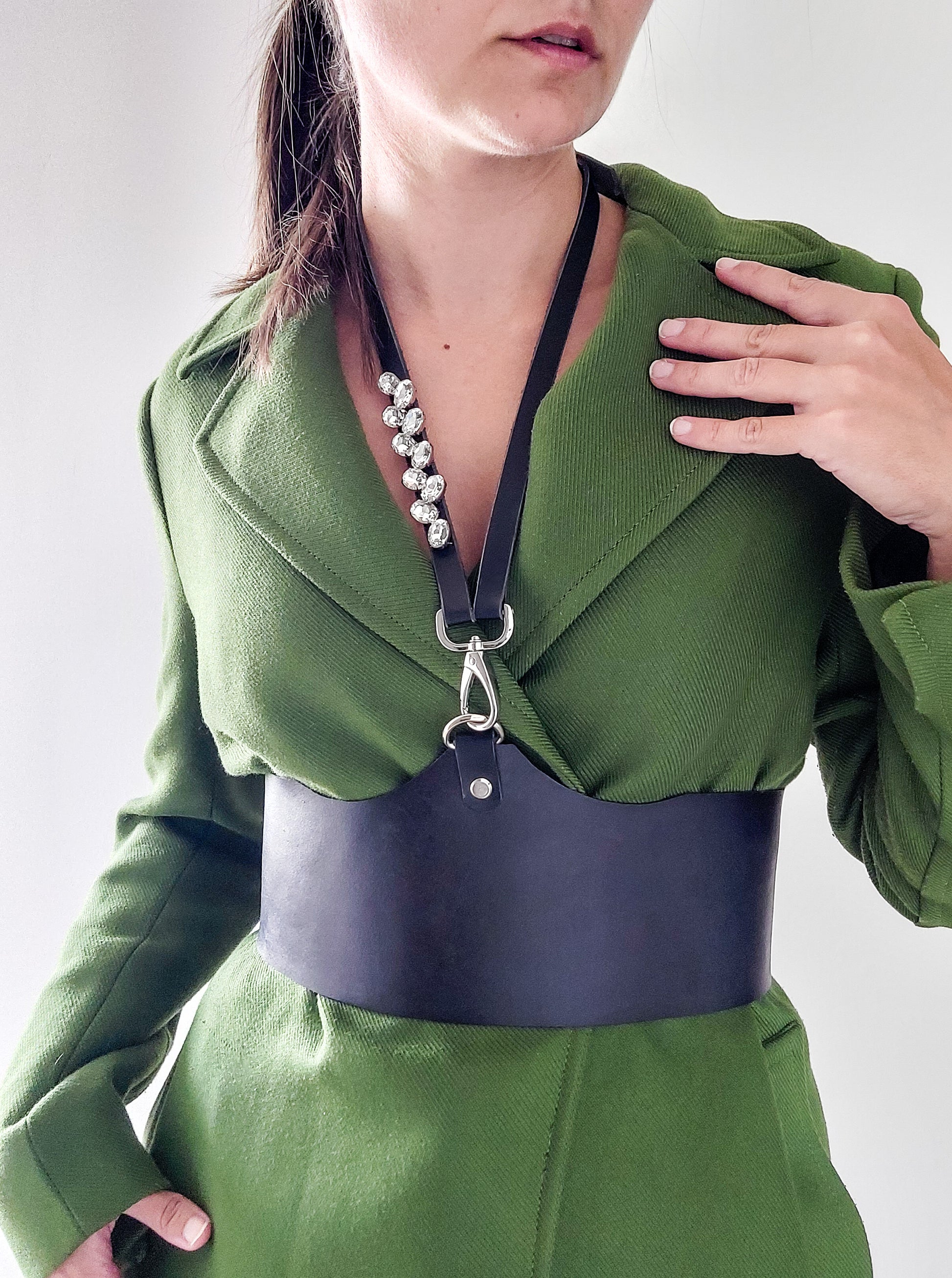 Zdobná část kolem krku je nastavitelná a odepínatelná, což znamená, že když budeš mít chuť na černý kožený minimalismus, nebude ti v tom nic bránit.