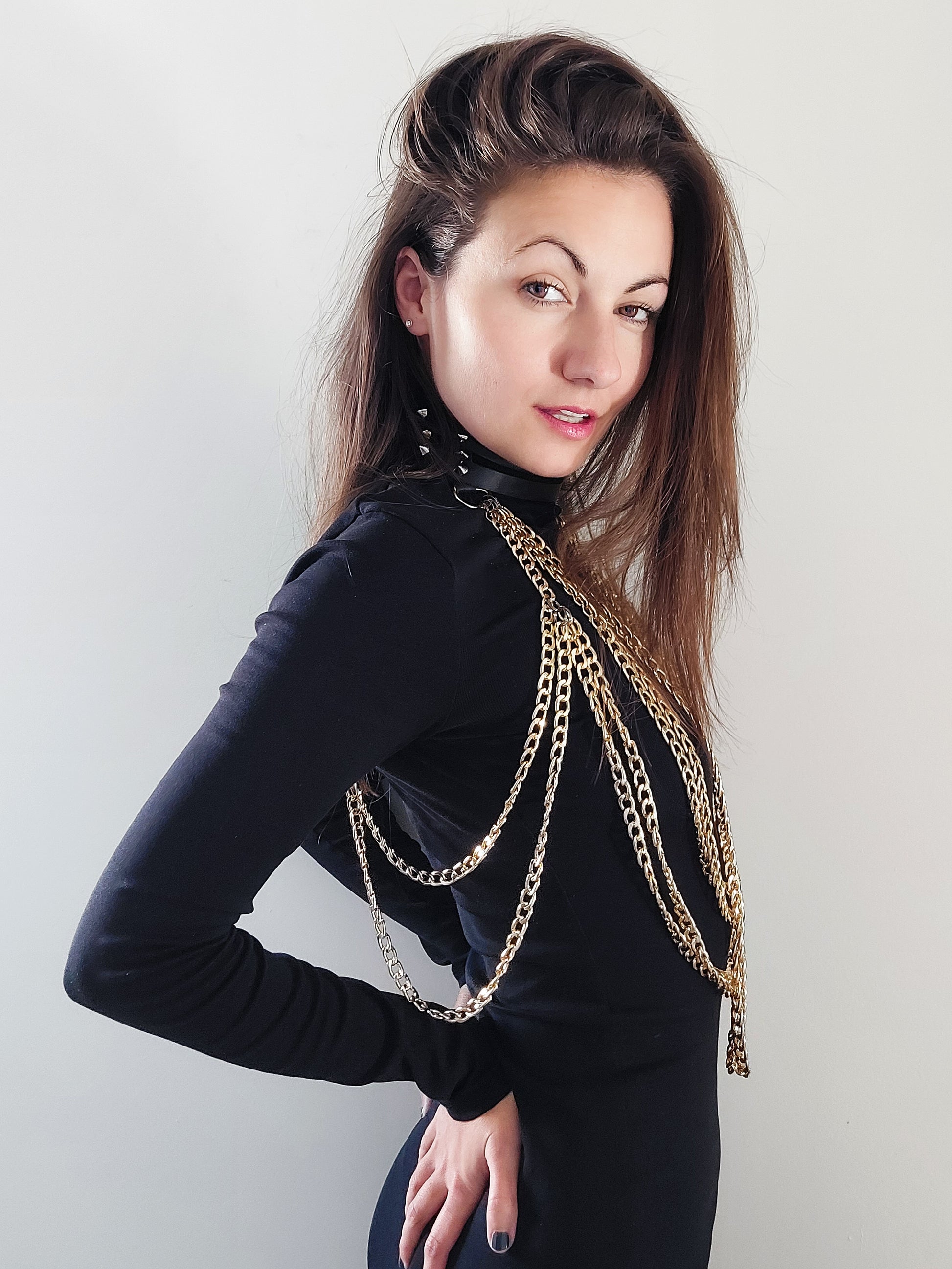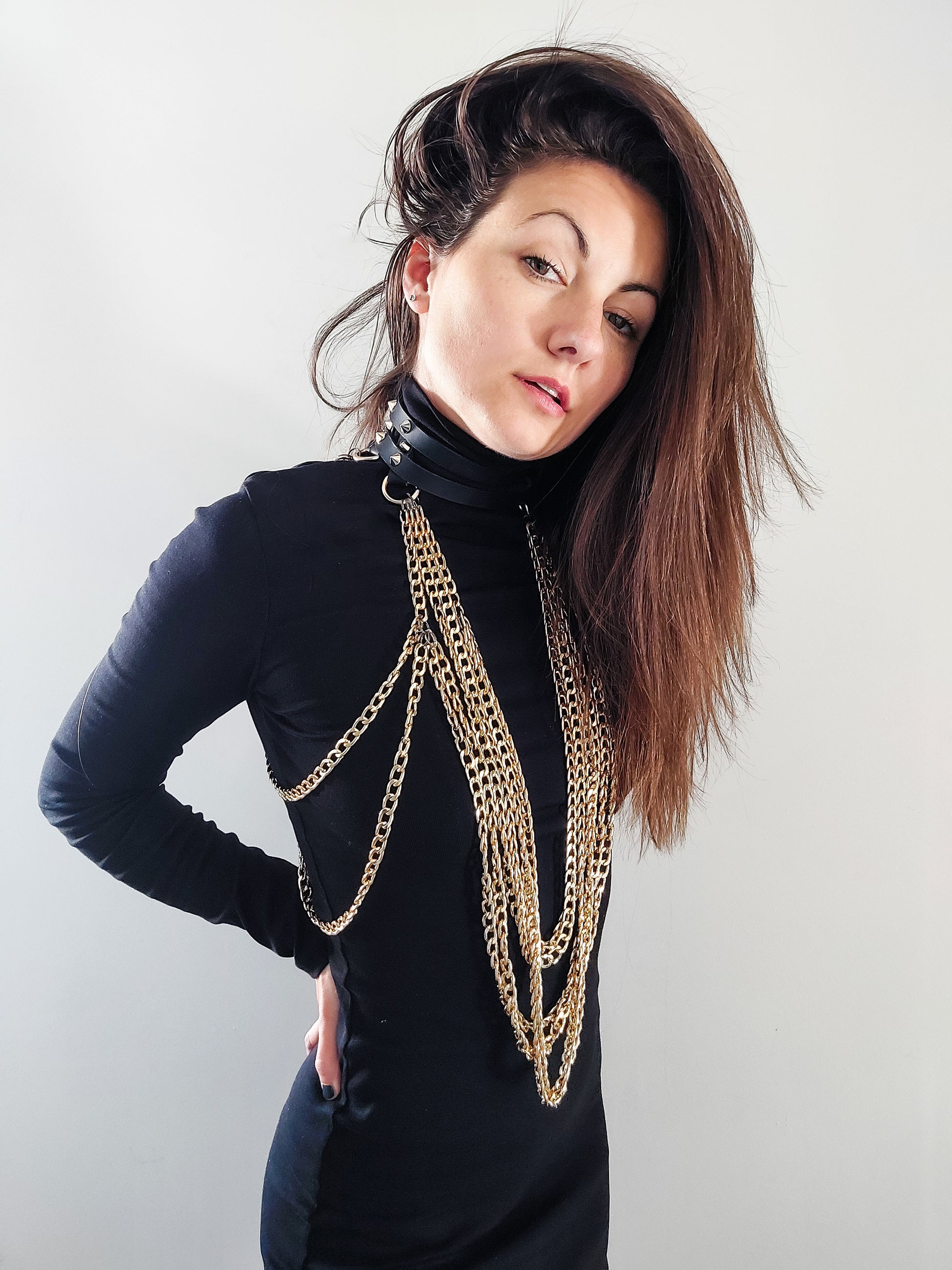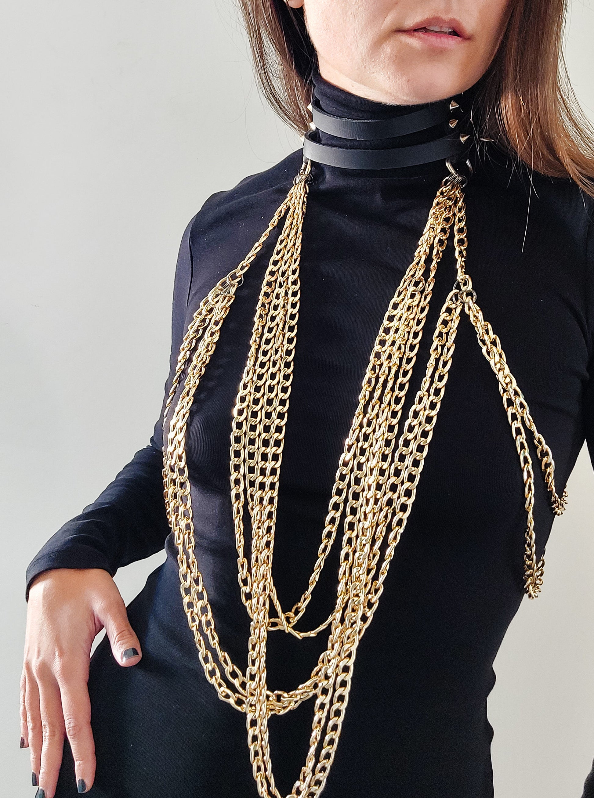 Dvojitý choker zdobený nýty a zavěšené poctivé řetězy udělají dojem na každém večírku, nebo festivalu.